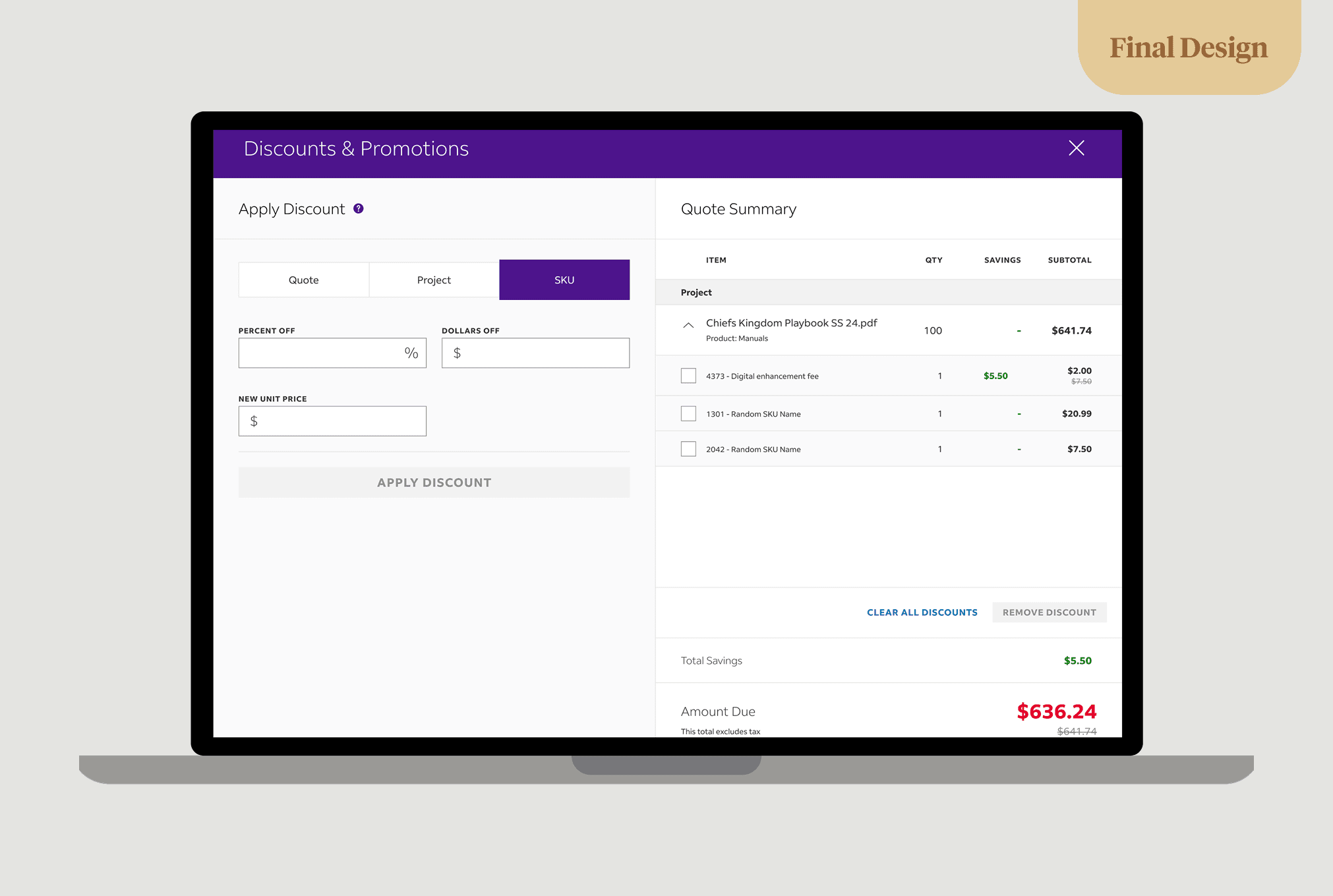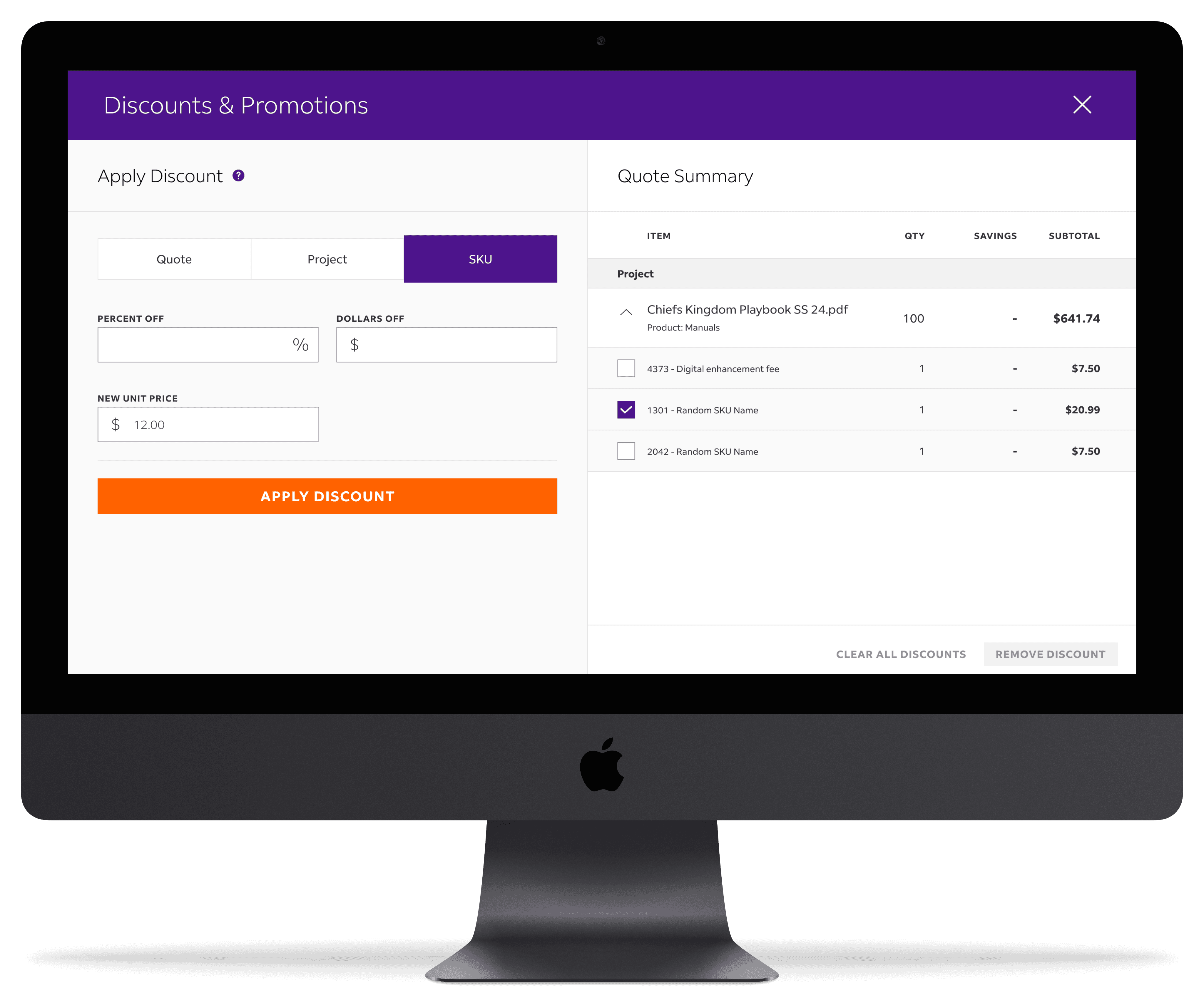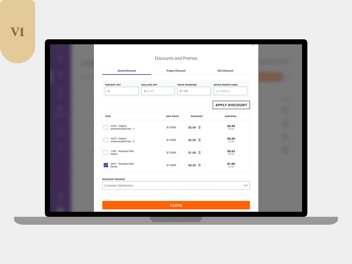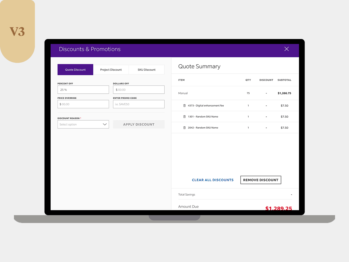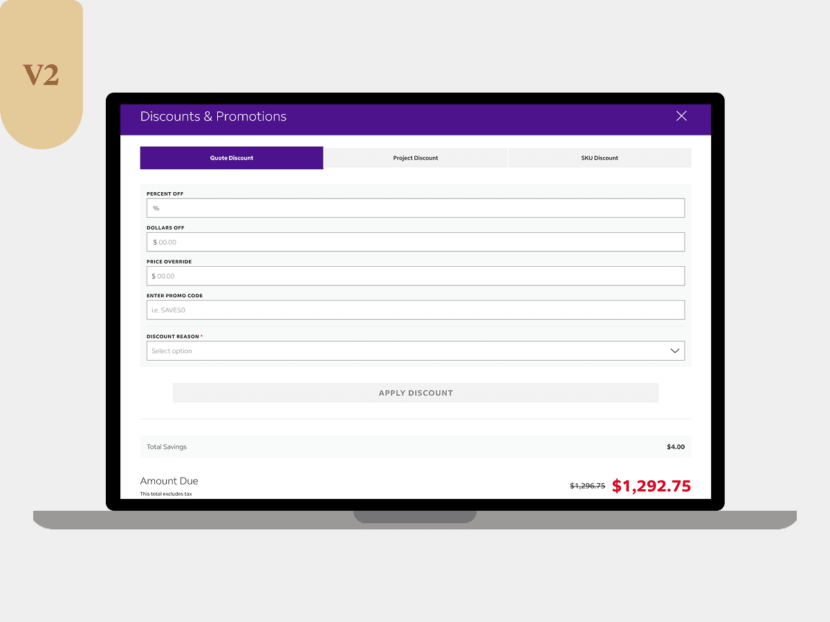 Improved discounting effectiveness & efficiency by allowing team members to discount at quote, project, and SKU levels with a simplified interface.