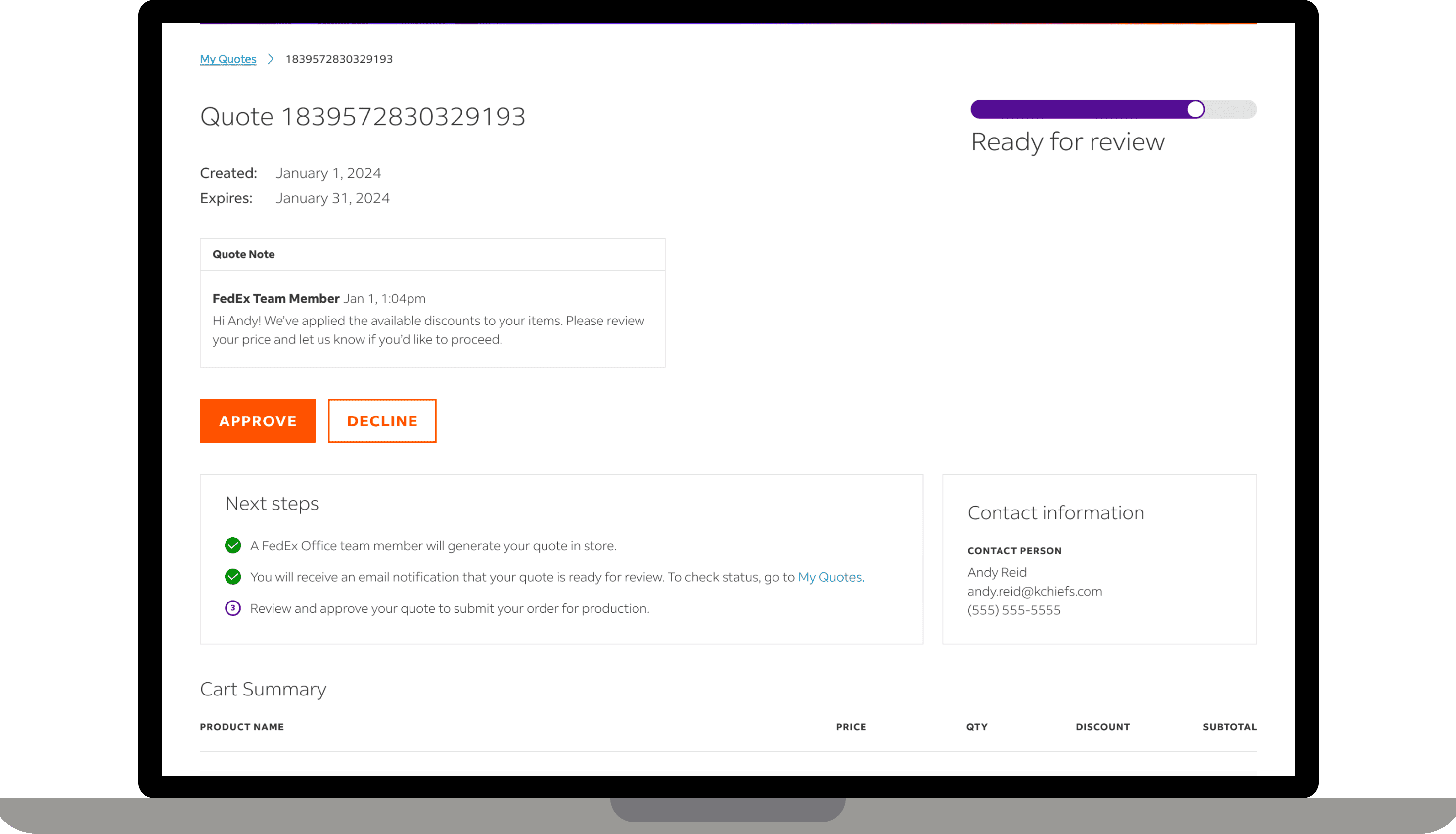 Customer can approve the quote and checkout for store pickup online.